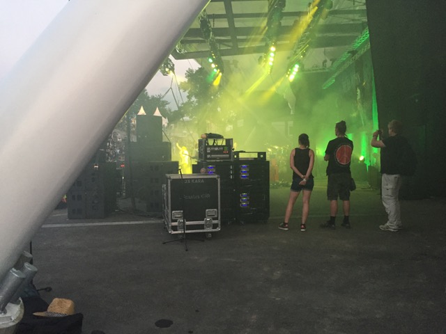 It’s late afternoon and Camel are not on stage until 10:30 tonight, so we go back to the van and try to relax, but the engine noise is driving us mad. Sometimes it goes off once the AC has reached temperature, but it soon starts up again. The back of the bus’s engine bay is also open to help with the cooling. It’s so loud.