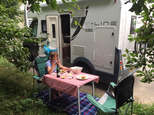 It’s a nice clean place, barriered entrance and nice pitches that we can choose from, but we are plagued with flies, loads of them. It’s hot, very hot, and we are still a bit tired from our noisy nights in Lorelei so we have bit of lay down. It’s too hot.
