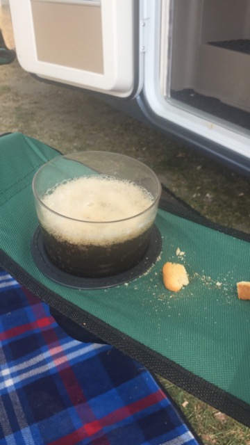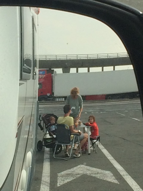 Other people have the same idea as one family has set up a full table and chairs outside their van and sit down to a full breakfast. Well why not?