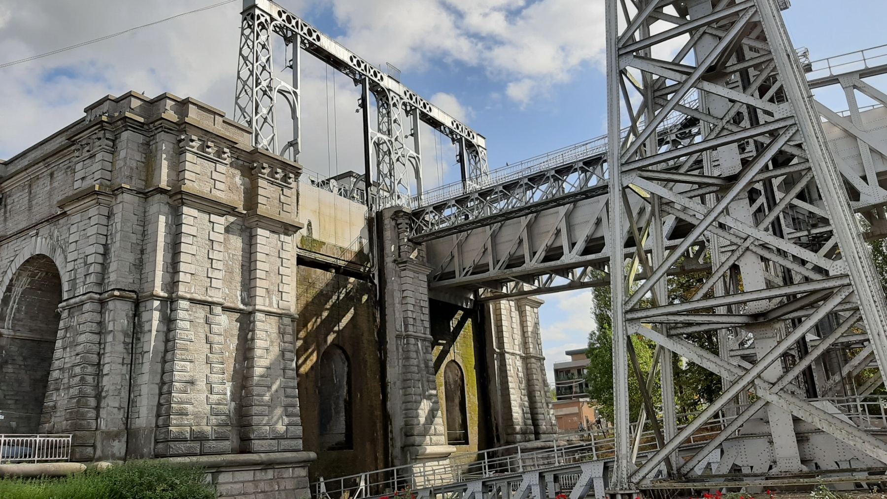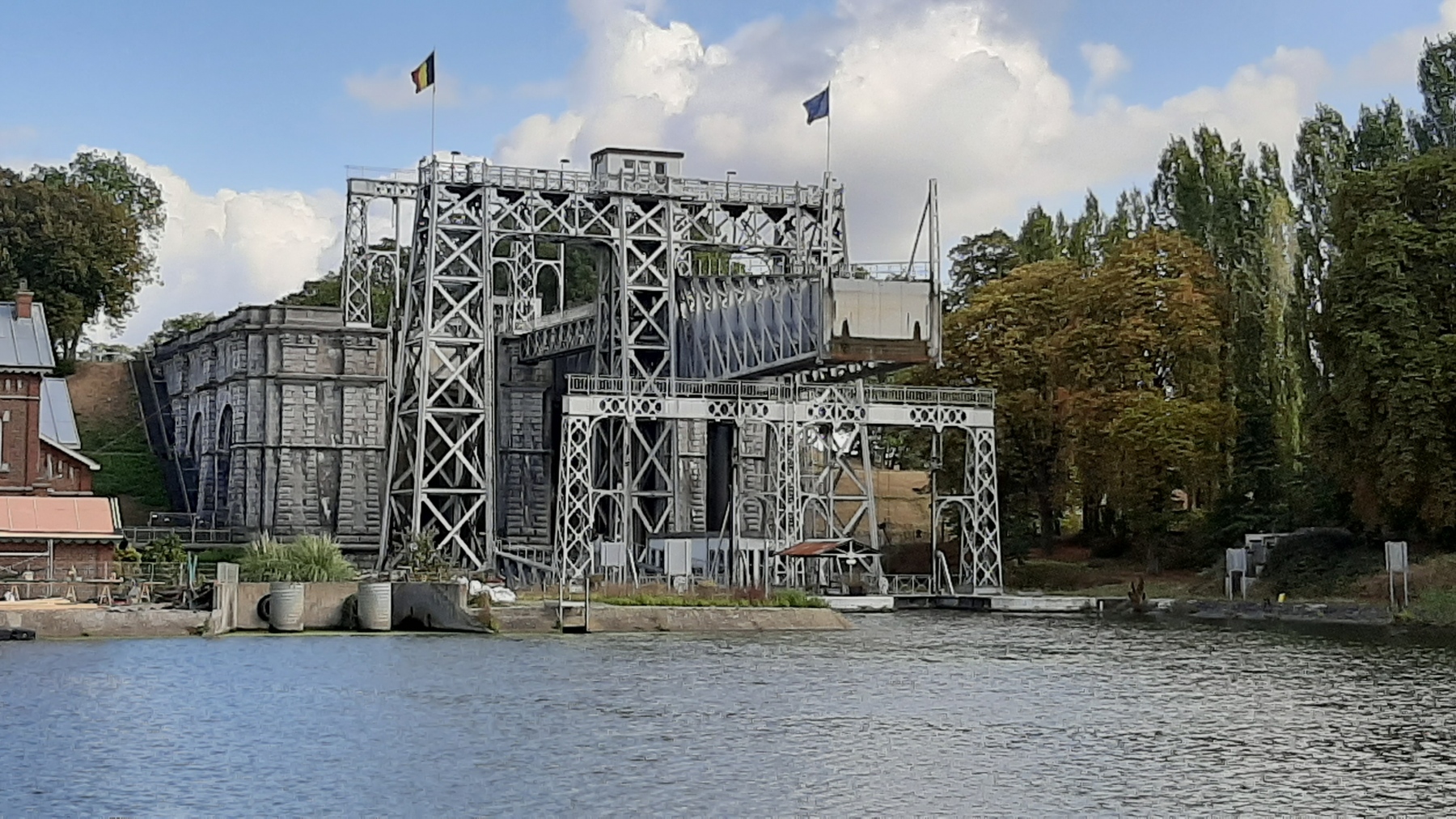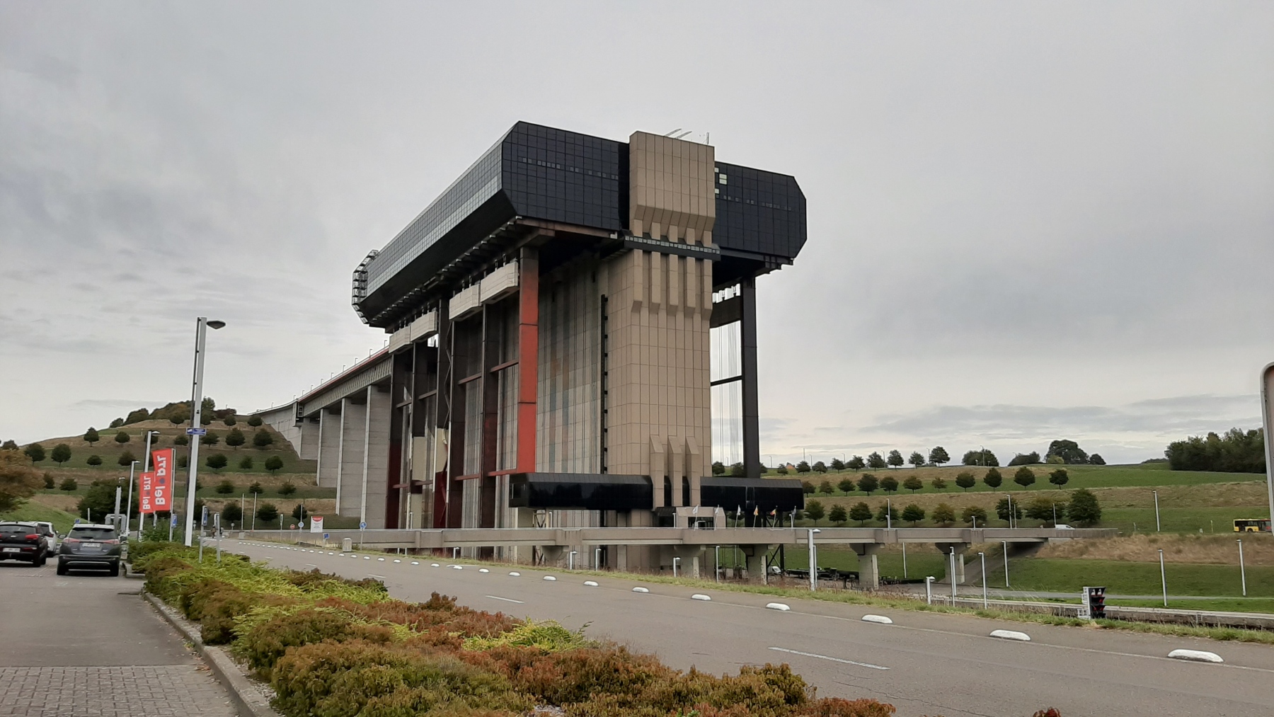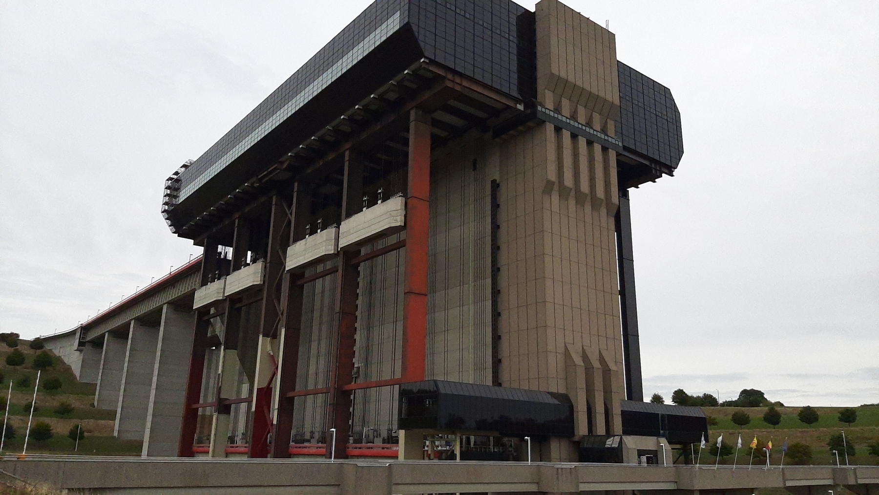 Time to take a look at the next one. This is the second tallest boat lift in the world but only recently, the Chinese have now built and opened the tallest. This one can haul a boat in a box of water up to 70m. In the town of Strepy the structure is quite imposing but the land around it has been sculptured. It does all look quite impressive.