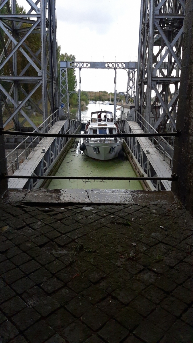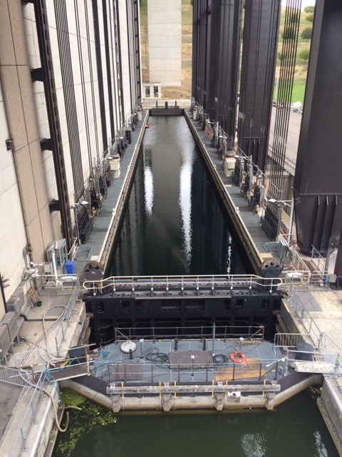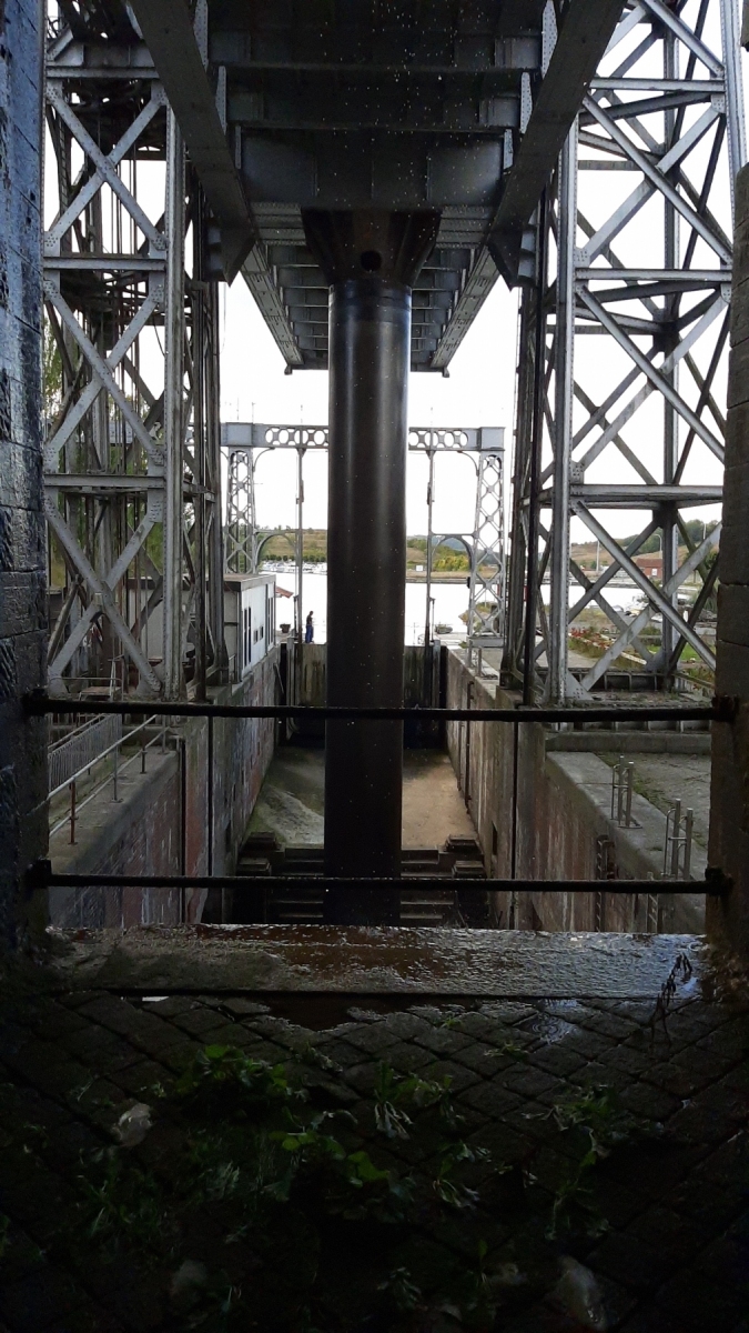 After our usual leisurely breakfast, we discuss where to go today. It transpires that Belgium has a fine collection of boat lifts. Interesting. These are not a simple or copied versions of the Anderton lift in the UK oh no these are BIG, massive and quite something to see when you get close to them. We find three that we can go and look at. So off we go to Thieu to a free aire and found what they call lift No.4, which is basically a hydraulic set of scales. You drive your boat into a box, you get sealed in with the water and it gets lowered or raised to the next level of the canal. on 2m wide, 30m high hydraulic rams. We were watching this from a distance as the area looked closed to the public but one of the local staff saw us and invited us down to have a look. No hi-vis vests, no steel toes boot or hard hats. No long speeches about the obvious dangers. He was fabulous and gave a full show and tell of the whole structure while a boat was being lowered to the canal below. Fantastic.