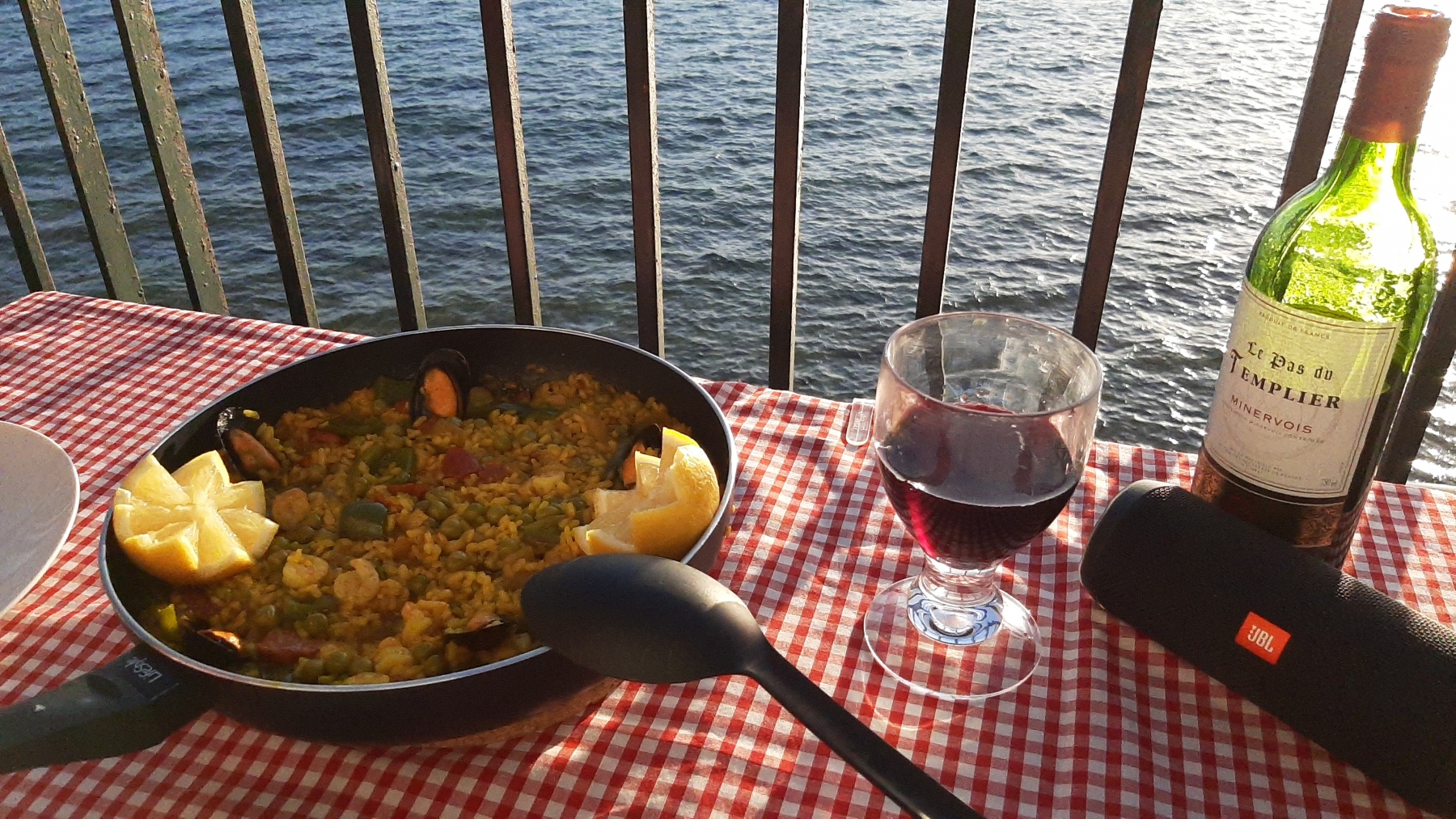 Dinner was a fine paella. Hayley is quite an expert at these. It goes down well with a glass of cold white, however as night is falling the mosquitoes are rising and Hayley is rather susceptible to them, getting bitten almost anywhere. No matter it’s getting on so we go inside to finish the bottle off.