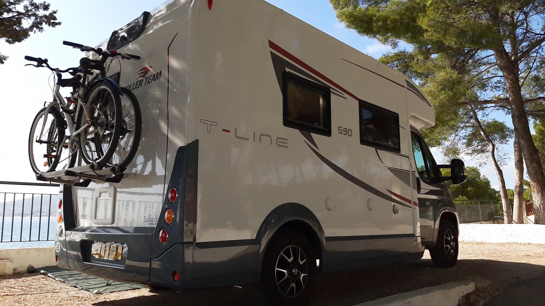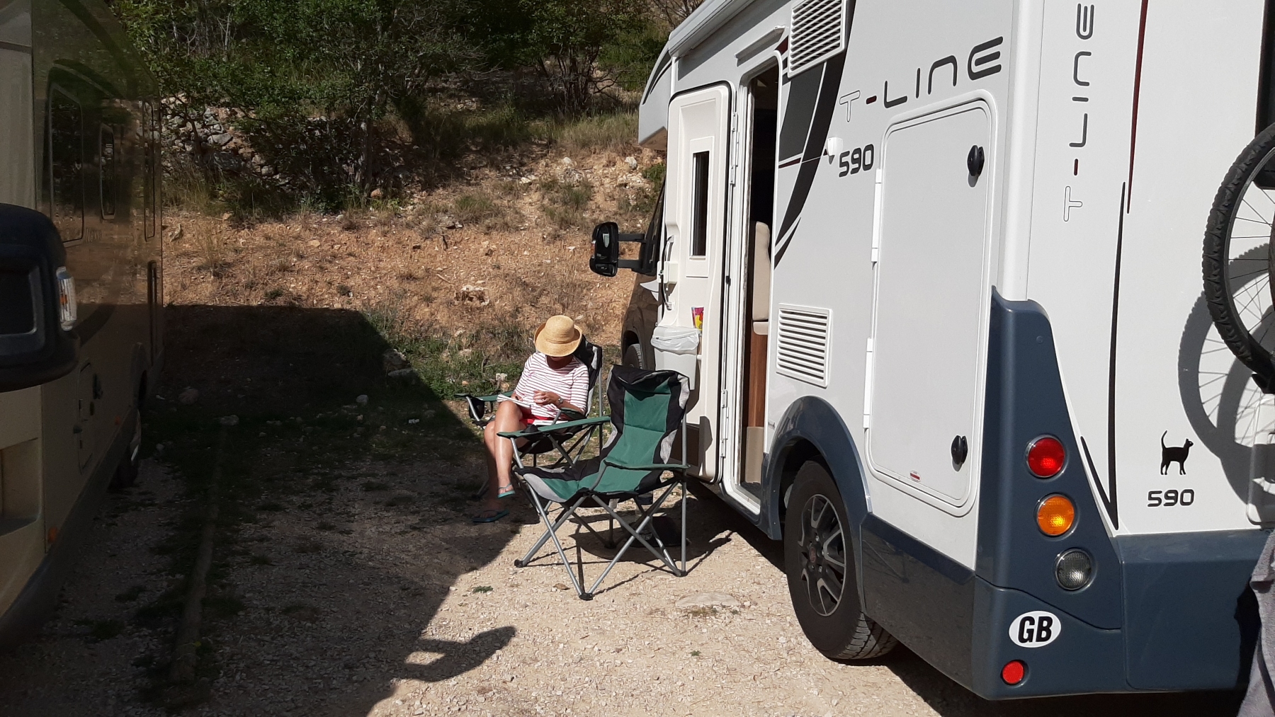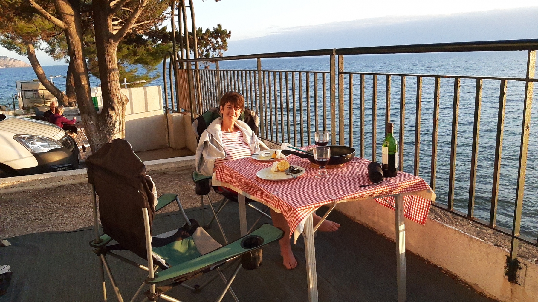We go into the grounds of the site. Well what can we say… It is amazing…. For small vans like us there are terrace views right at the front with a full uninterrupted view of the bay, high up. Stunning. The site itself looks like it is stuck in the 1960s/70s but it’s popular. We are out of season but some pitches are already taken but we are lucky to find the best one!. The highest one as well. Brilliant. We set up with all the garb, chairs, table and all that when Hayley spots a kayak place right under us. She can’t resist so off she goes for an hours punting on the Med while Del cleans up the van and prepares cold beer for her return.
