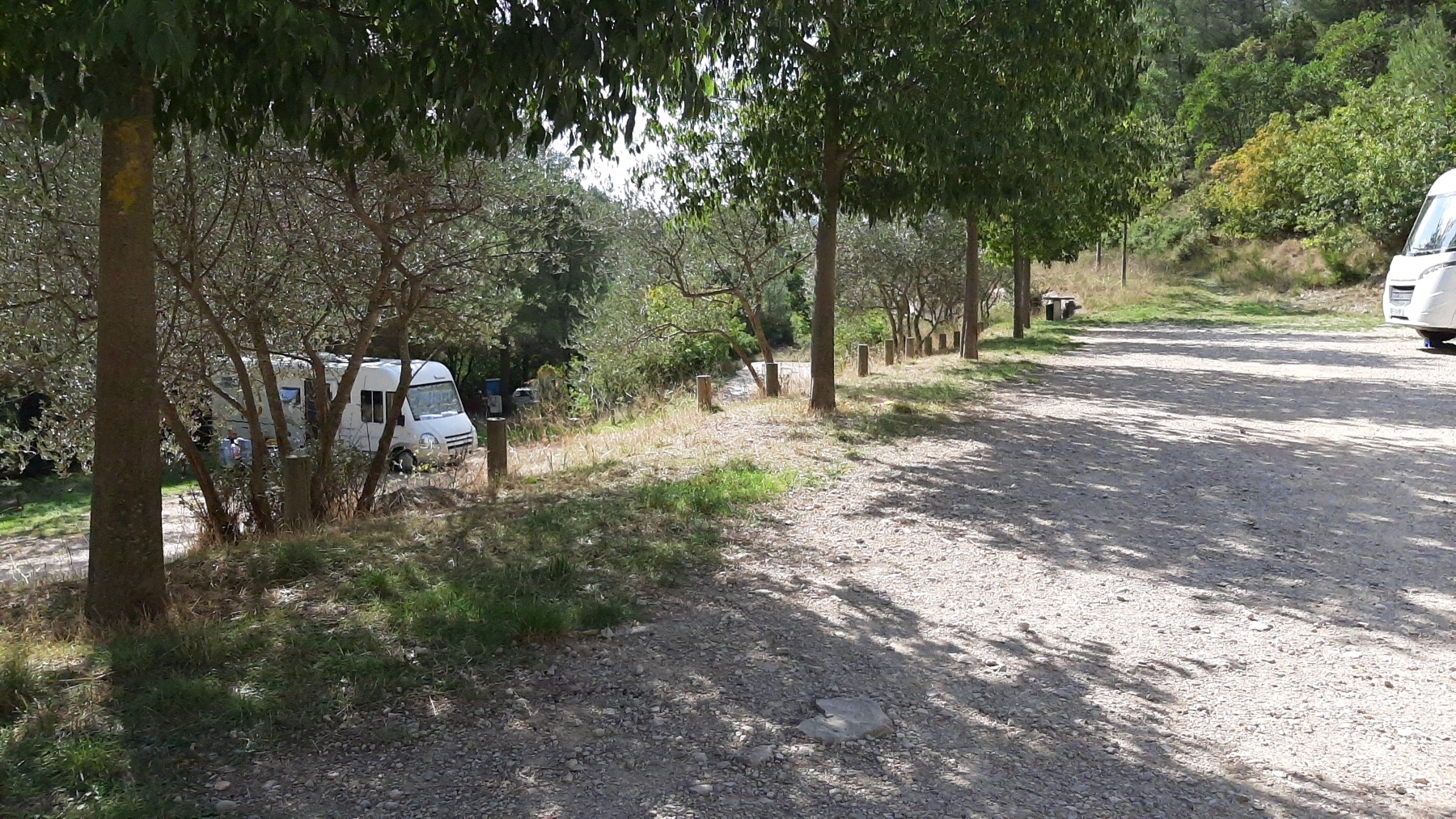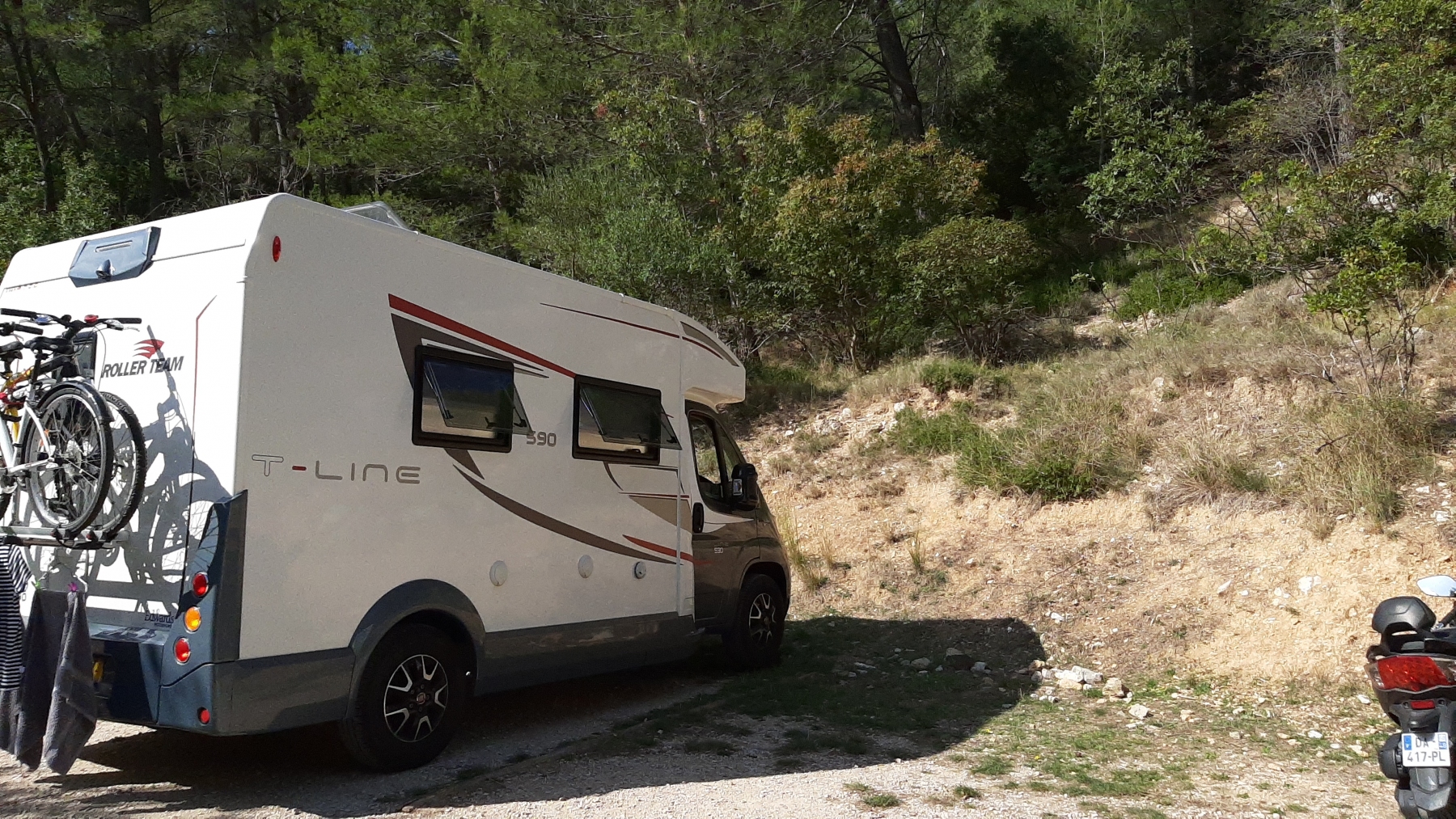 We finally arrive at the aire in Cuges les Pins, again after being sent up a local narrow road around the back of the town. Once there we pick our spot. Yes. It’s lovely. A contrast from yesterday. Dead quiet.
