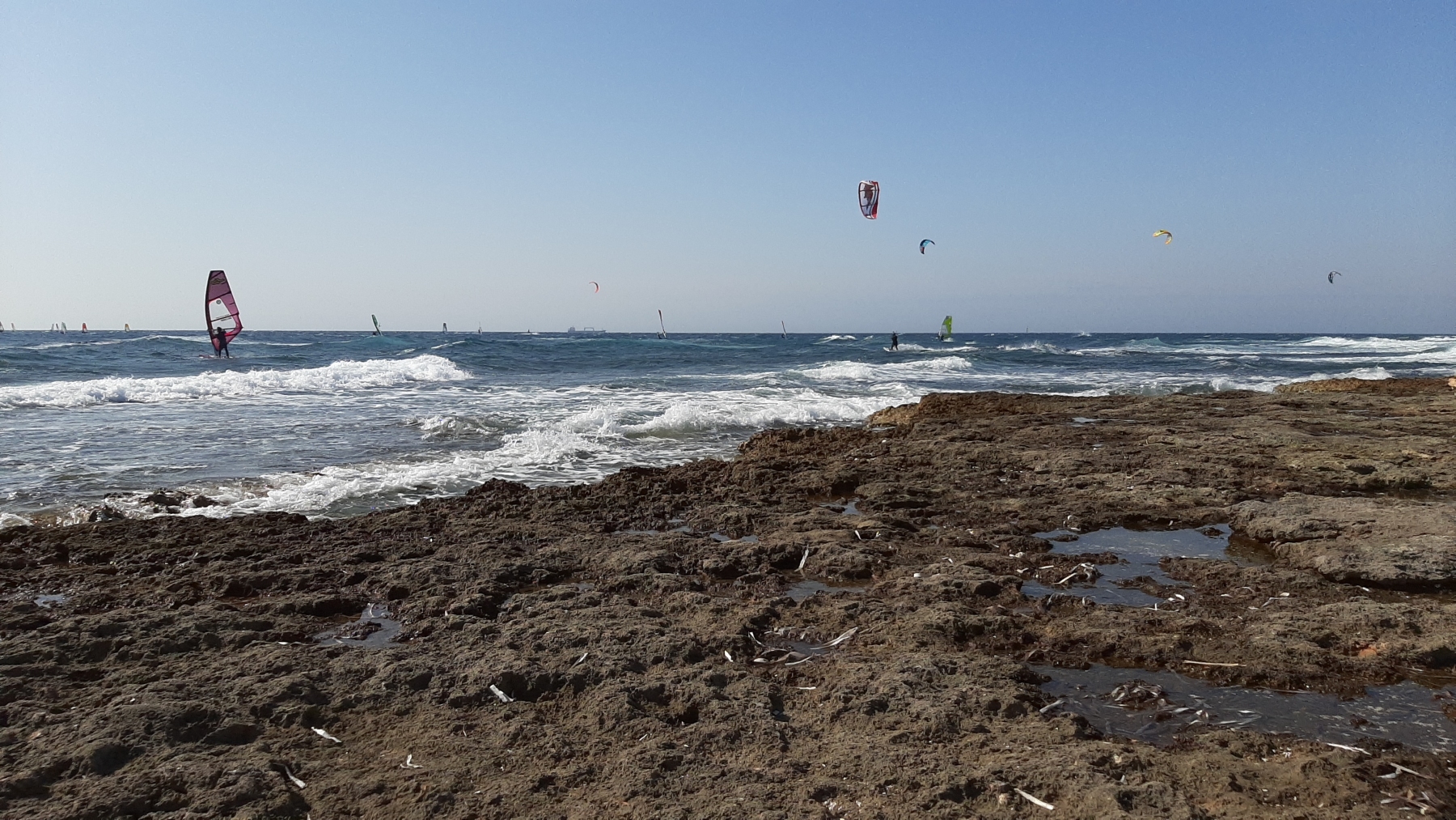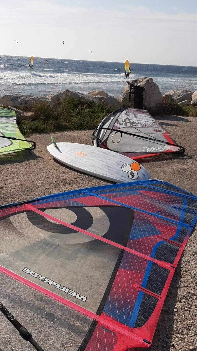 We set off after a quick attempted fuss of the goats. The day improves and gets sunnier and warmer as we head further west. We arrive at Carro, pay our fee, and Hayley finds the last beachfront view… Wow! amazing. The sea is turbulent and frothy but it’s sunny and hot and sure enough, the windsurfers and kiteboarders are out in force, loads of them… There must be 50 – 60 of them buzzing about like flies. Great to watch.