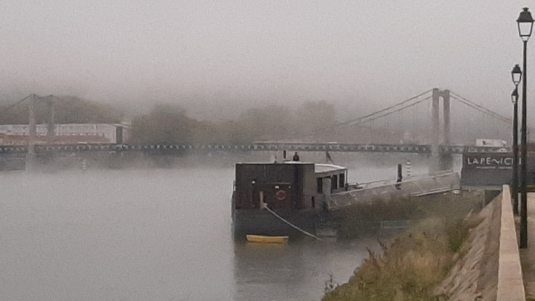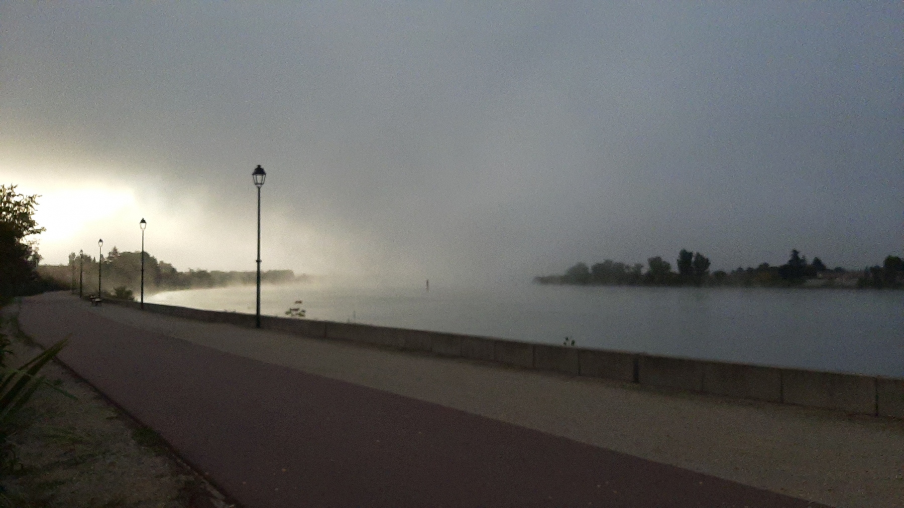 We like here so we will stay another day. It’s a nice place right by the river, the site is peaceful and pleasant. We get up this morning to fog. Thick fog. It’s spooky as there is a layer of the fog moving slowly along the river, the large barges loom out of it as the sun tries in vain to push through. It’s cold but not biting cold, enough to get a hoody on. Very picturesque and a sign that autumn is fast upon us. We are reminded by the leaves that are starting to fall quicker off the orange and red trees. Quite beautiful really.