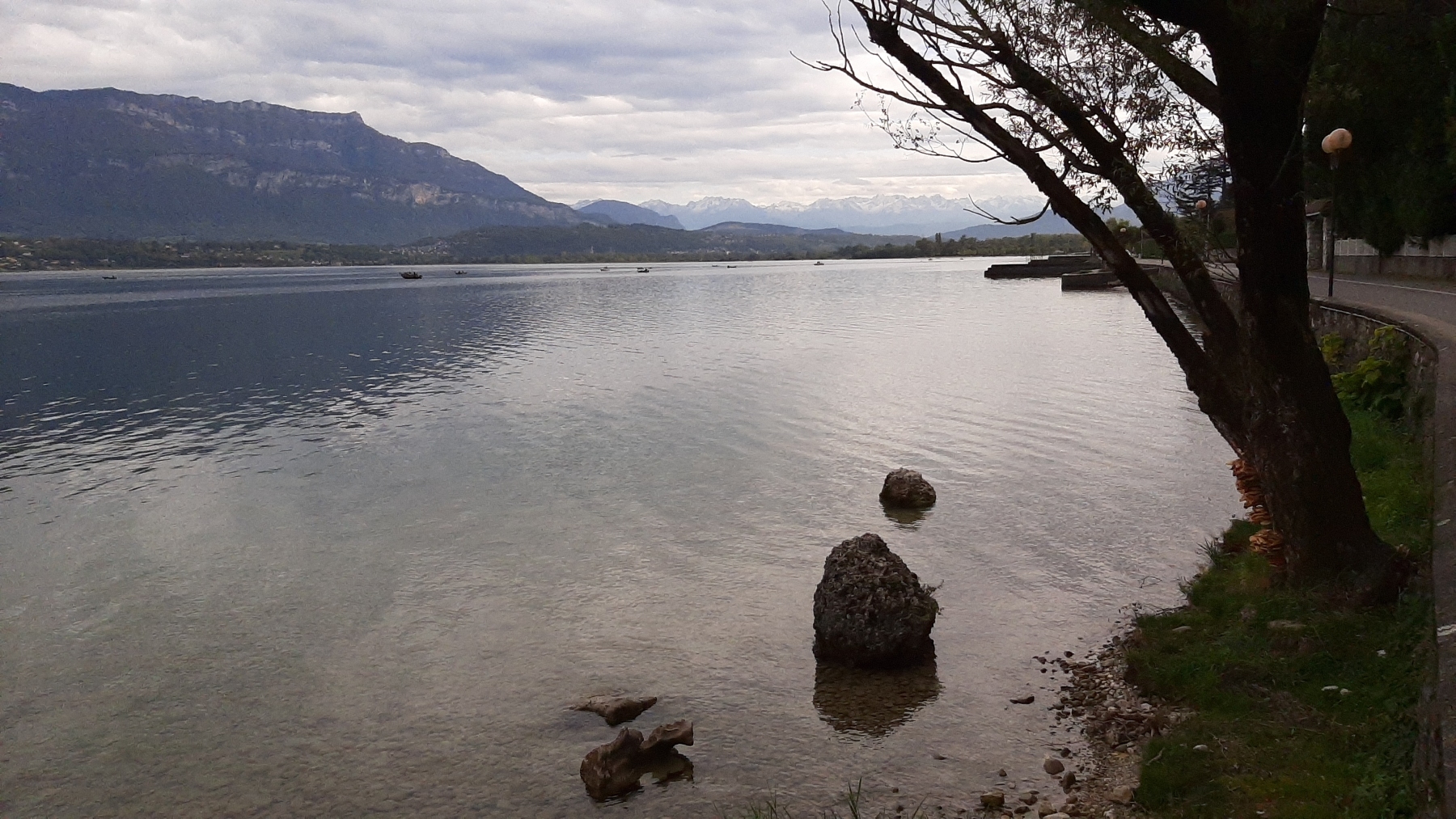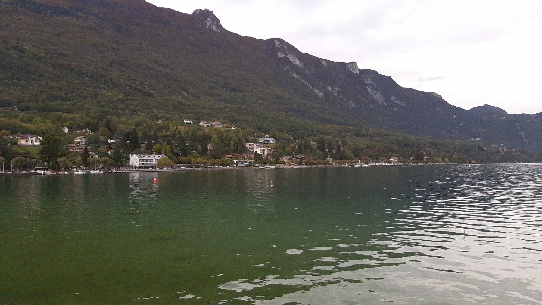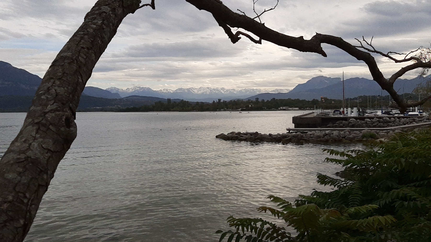 Eventually, we navigate our way out of Grenoble and get back on the right road. It’s raining on and off but by the time we arrive at the Lake it has cleared up and it’s a lovely bright afternoon.