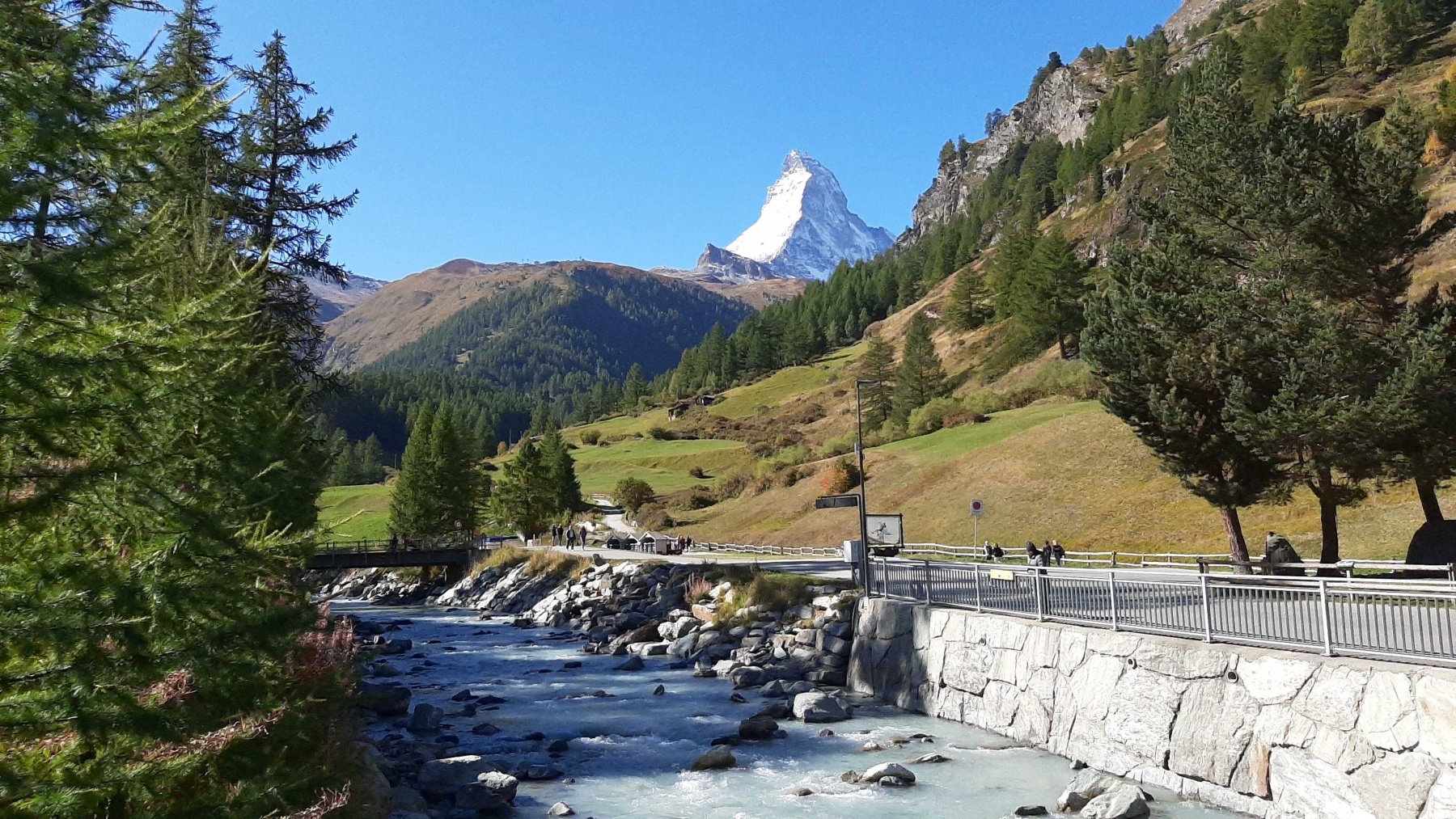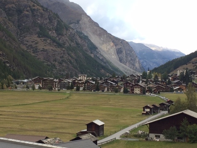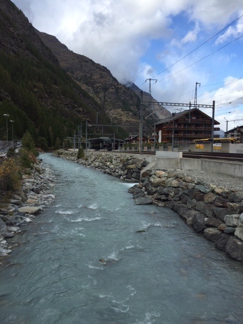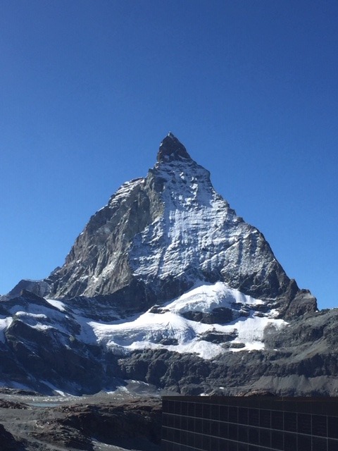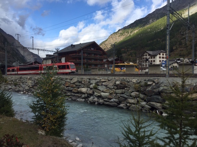 We are up quite early and as usual the long breakfast is long, but by 11 we are off and making our way to the station here in Tasch to get the train for the 20 minute trip to Zermatt. The weather is lovely. Clear blue sky, not a cloud in sight and just on the verge of being cold but pleasant. The trains here are immaculate. Not a spot of dirt or graffiti to be seen, nobody sits with their feet up on the seats, it leaves bang on time and is very smooth even the bit where it has to climb the hill and change to a cog system, you’d never know it had happened until you look out the window and the horizon is at 12 degrees.