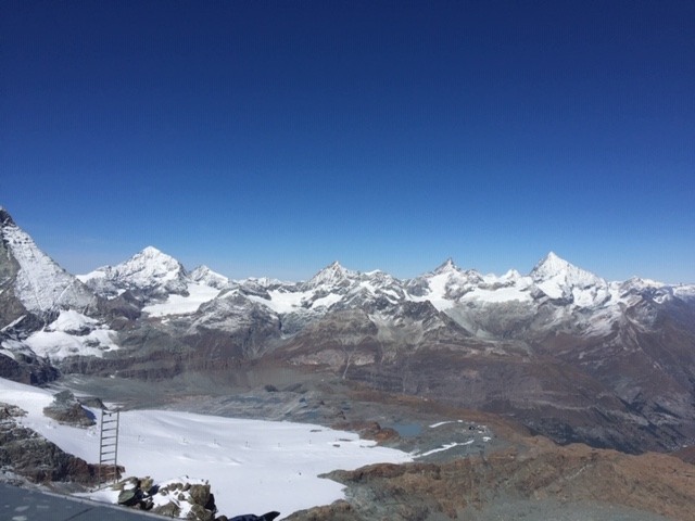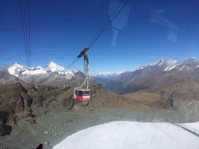 We get to Zermatt and decide that yes we will spend the 80 quid each on the three cable cars that haul you up to Little Matterhorn. It’s a short walk so we have a look at the shops in Zermatt. The prices are eye watering, 20 quid for a pizza, 40 quid for a Schnitzel and on it goes. Despite the extortion the place is full of tourists. We feel quite poor on our relatively small daily budget. It’s crazy how many people are spending so much money on simple things like food and drink and even more or what some might think is just tat. Takes all sorts.