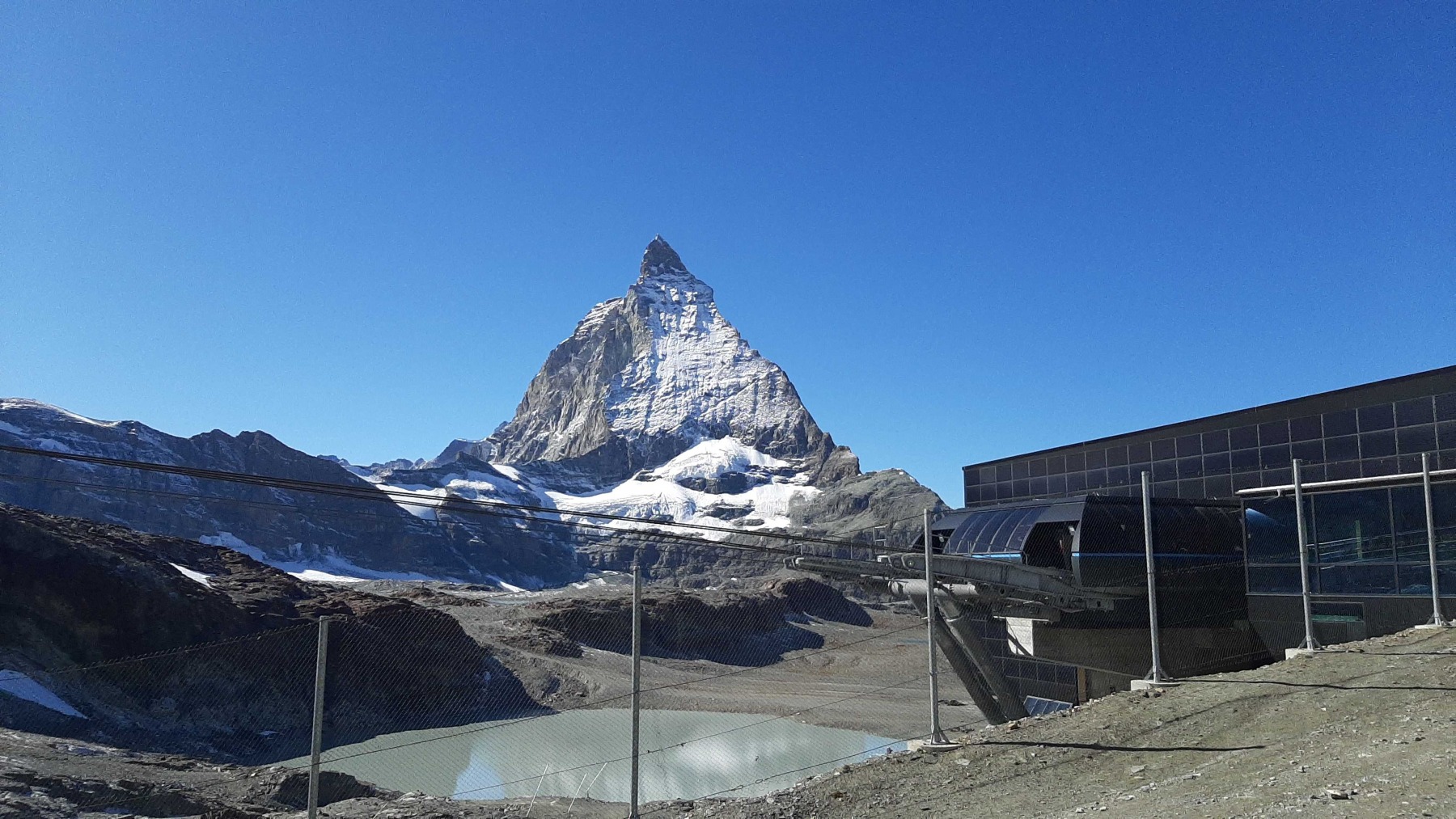 After 10 or 15 minutes we have to change to another car. This one is full, about 40 to 50 people are in the car as it slowly moves off and starts its slow ascent to the next level and to the last car. The final car is loaded up with people and off we go to the top, the highest cable car station in Europe, but with it comes the most spectacular views, breathtaking. The Matterhorn is looming high on our right as we go up and the slopes are slowly getting covered with more ice. It just looks amazing and difficult to describe the beauty of the place.