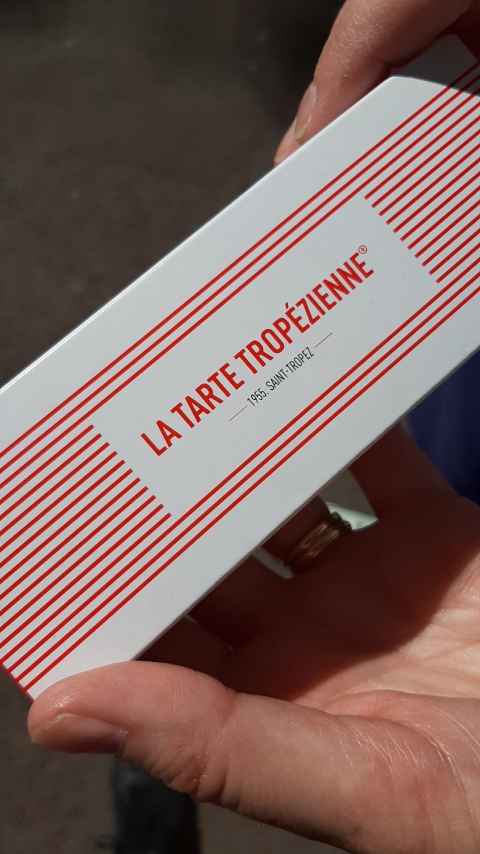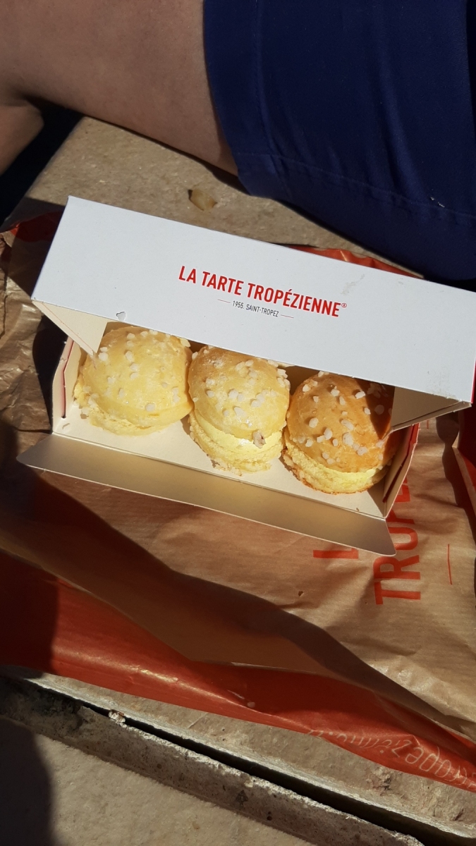 After a good walk around the place we decide to by some sandwiches and a local speciality – pissaladiere. A pizza base with some onions, olives and anchovies. We also get a small box of Tropezienne Tart which is a custard cream cake. Sweet but ace… They make them in different sizes from small take away boxes of three to 12 in a box up to a large 12 inch thing that makes your pancreas work overtime just looking at.