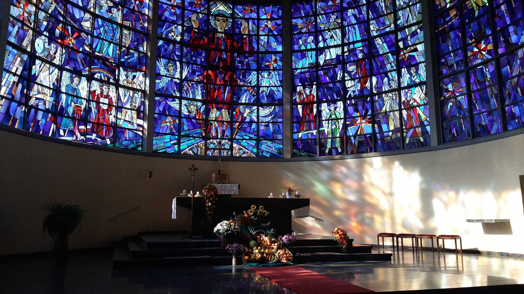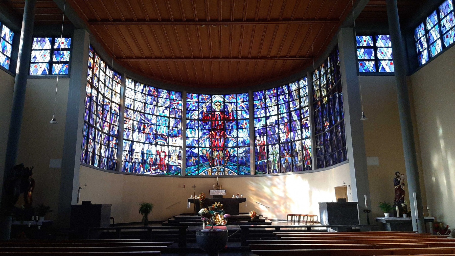 We wake up to another clean, clear sunny morning. Today we are going to drive further into the black forest to campsite called Camping Langenwald near the town of Freudenstadt. Before that though we thought that we would have a look at the local church here in Forbach which by church standards is quite young built in 1956. We read in a review of the area that it had some OK stained glass windows. Well OK is an understatement, they are amazing. Very colourful and they stretch in a panorama the full width of the building. Very blue!