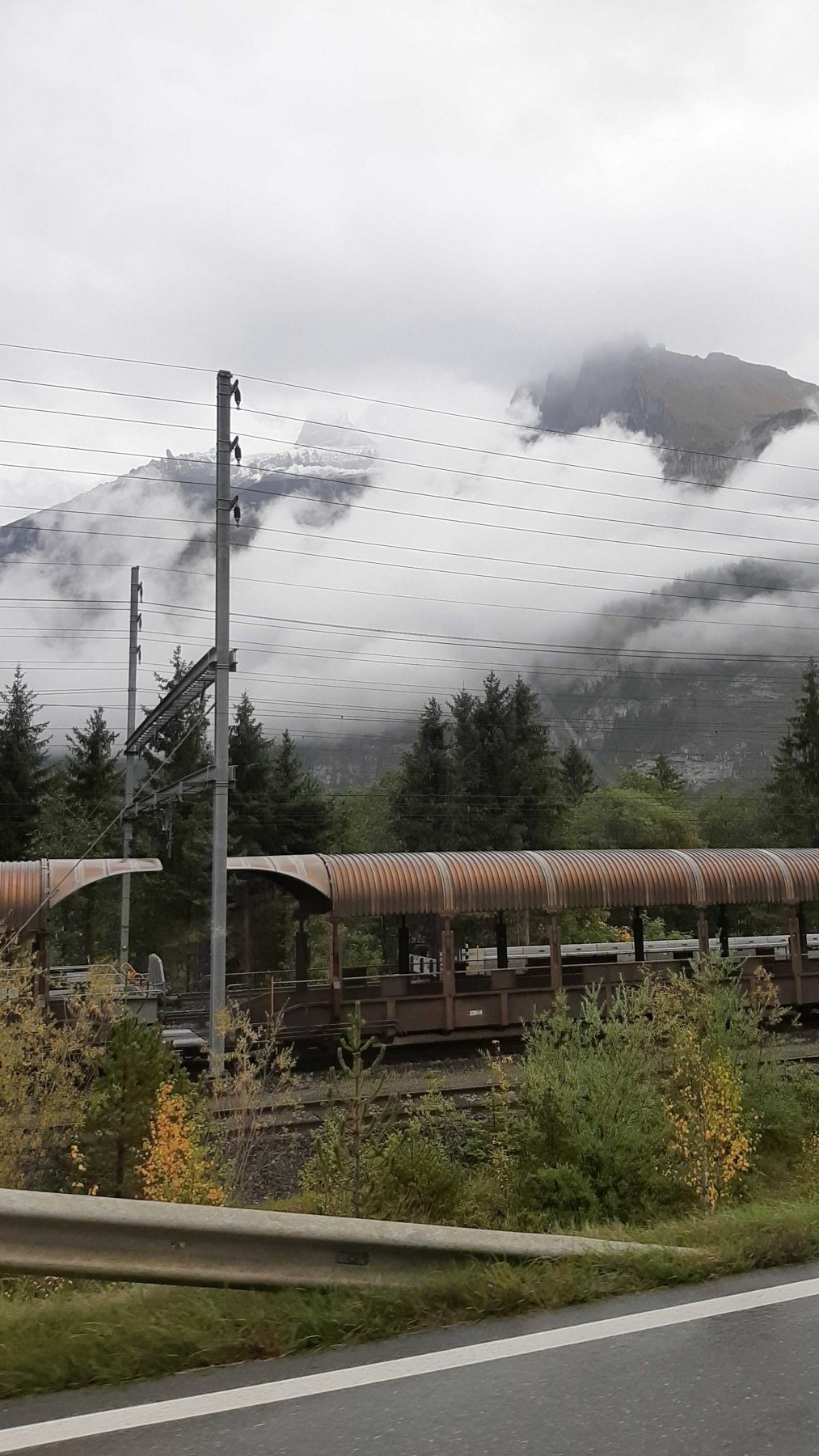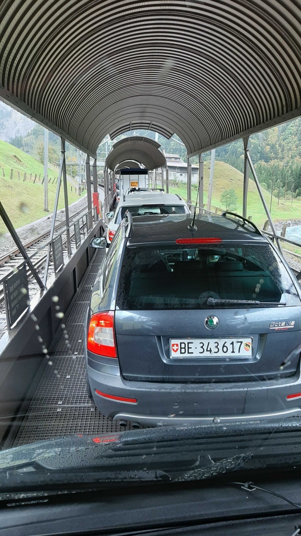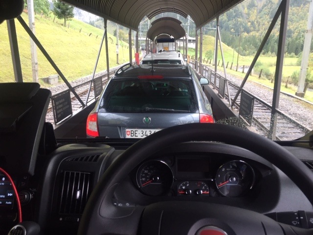 We suddenly appear at a toll booth and get 27 Swiss francs taken form us, why? We are ushered onto an roofed and open sided train, Hayley just about squeezes Jess onto the train with inches to spare all around and before we know anything else we are off. The train is speeding through a 14km tunnel. What an experience, in your van, on a train, in a tunnel in Switzerland and still we have mobile phone reception. Amazing.