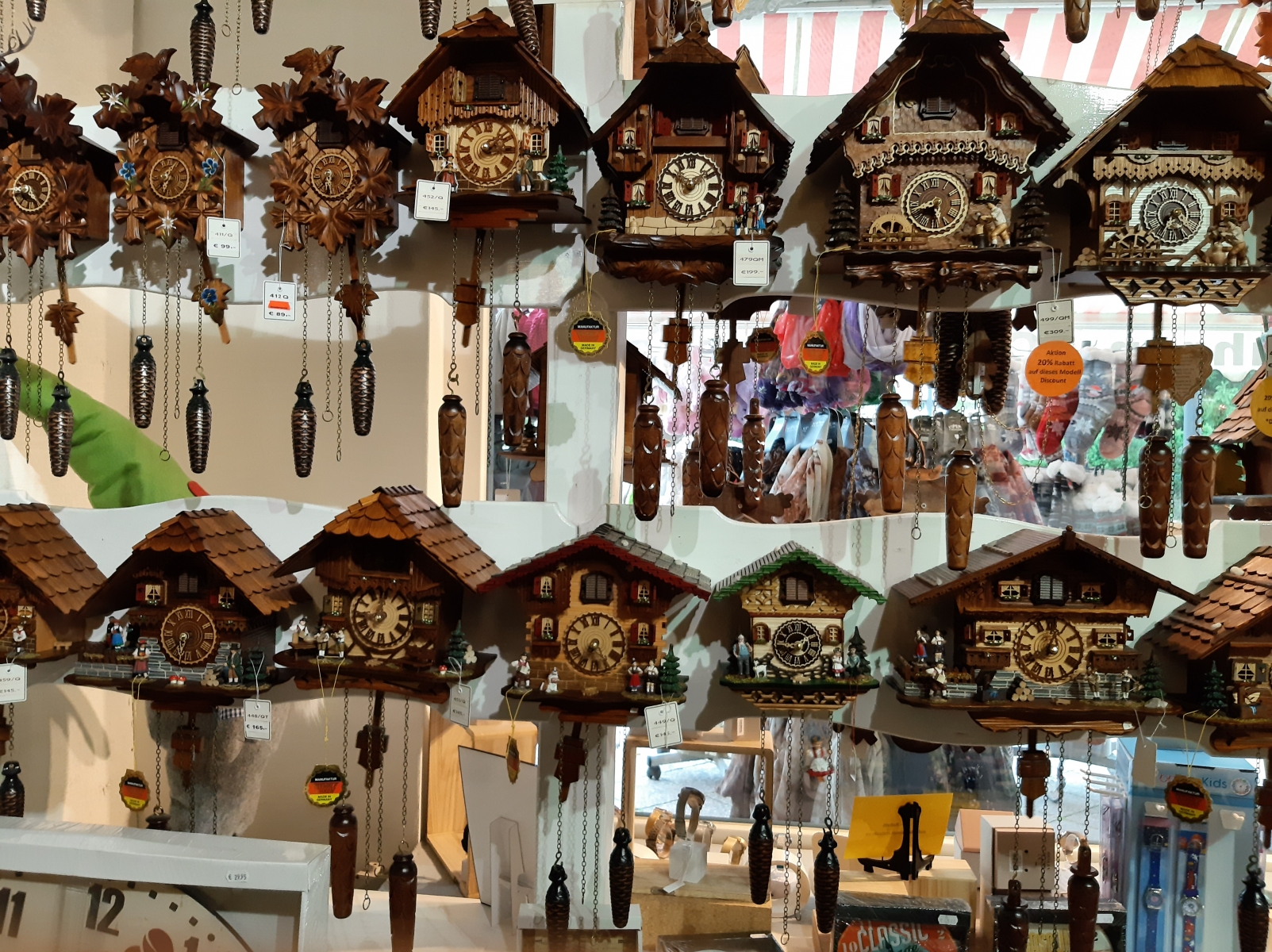 Lots of shops selling cuckoo clocks, but loads of them, hundreds, in fact, one shop boast it has 1000 cuckoo clocks… They are all set at different times so that they don’t go off all at once.