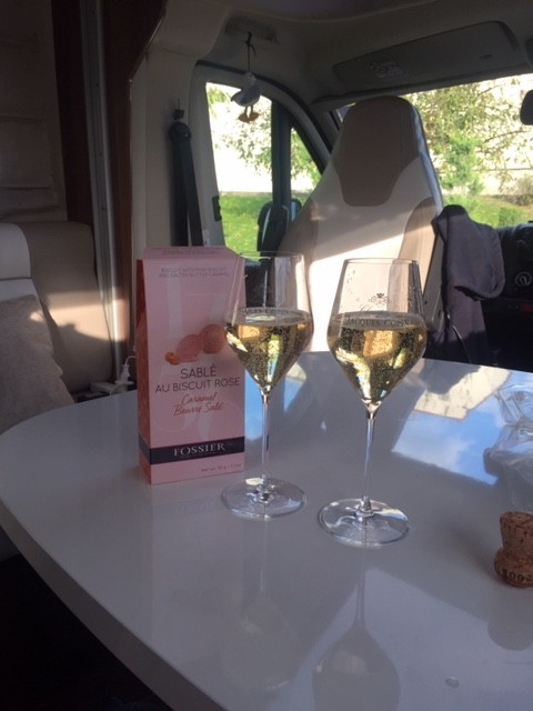 We know a wonderful champagne house in Verneuil called Jacques Copin. We have been there before as they have an aire there where you can stay free of charge, it has everything we need, water and electricity. You don’t have to buy champagne from them but it’s polite to do so if you are staying. We sample a couple of glasses of their finest and walk out with 9 bottles of fizz, two glasses and some biscuits. Smashing.
