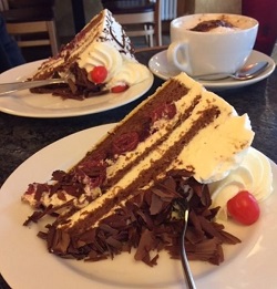 It does not fail… It is amazing. Del has a BIG Cappucino, Hayley and mint tea. There is silence while we dig into our large “stuck” of Schwarzwalder tort. Delicious. Lots of cherry liqueur and cream with a thin crispy base. We will never get this anywhere else…