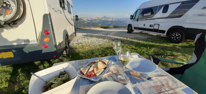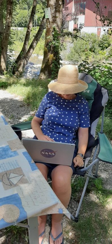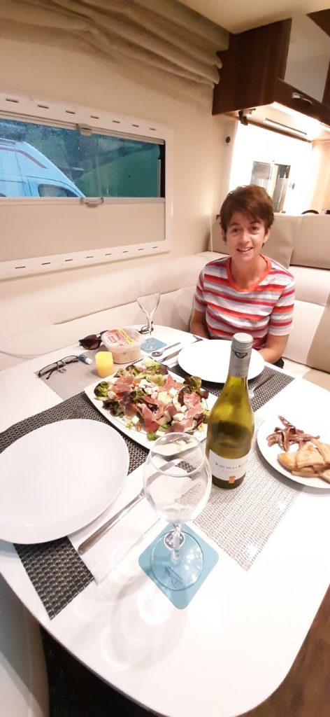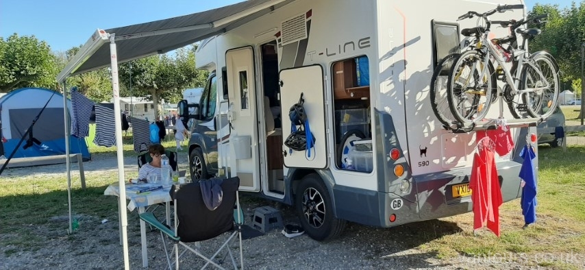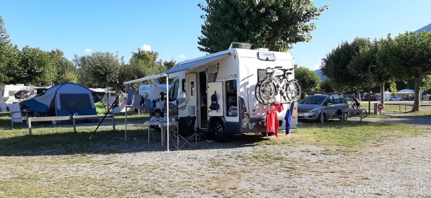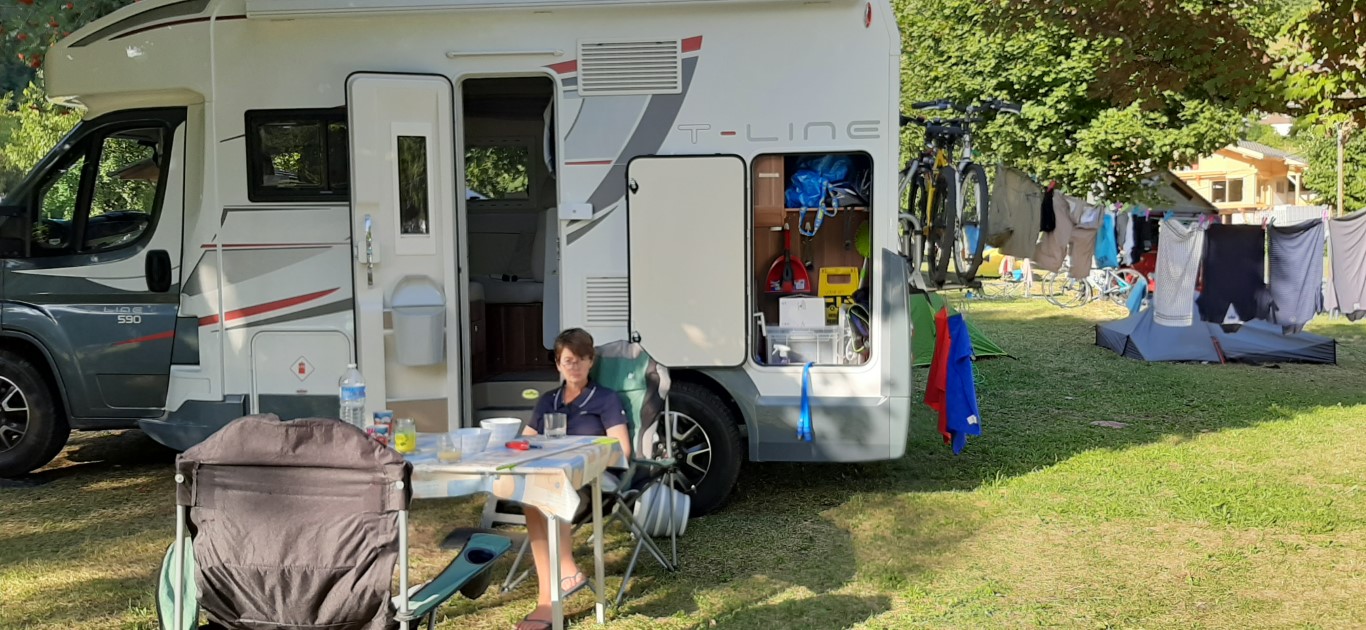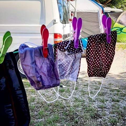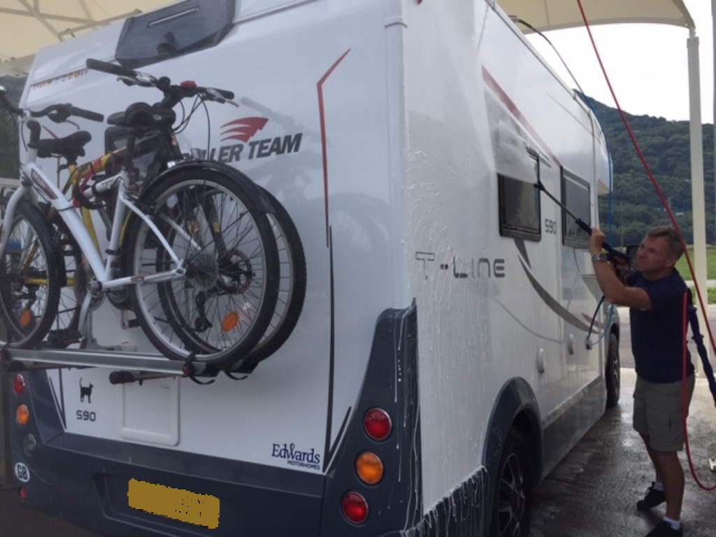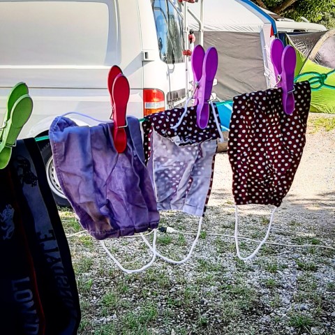 Our time comes and the lady from the site takes Hayley away to find our pitch. A lovely lady who speaks excellent English and explains the rules of the site and how everything has to be just so. Excellent. We like that. We are given just what we wanted a large flat pitch, in a corner surrounded by trees. Perfect. We get set up and settle into our new home, getting a pile of laundry done while we are here.